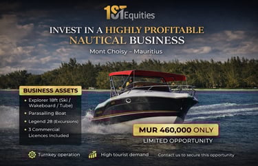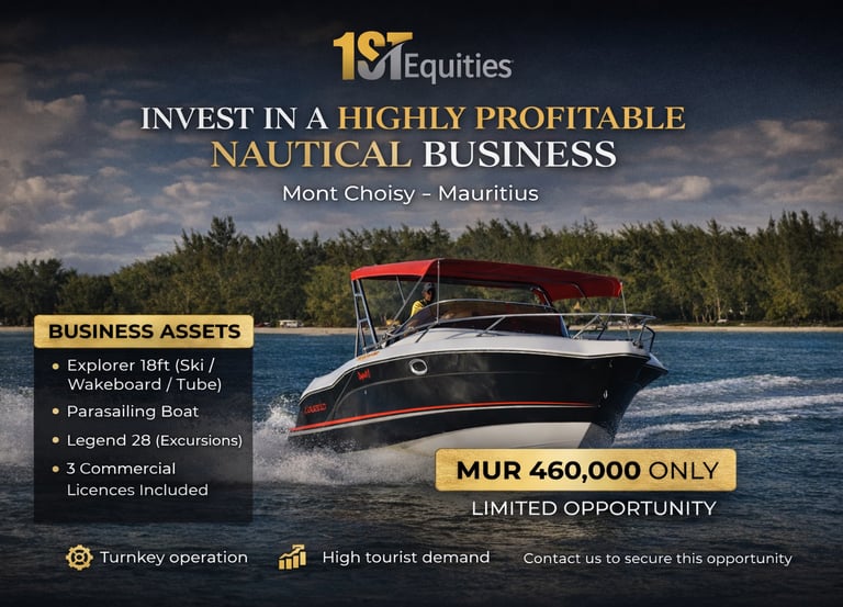 fully operational nautical business located at Mont Choisy Beach, one of the most frequented beaches in Mauritius. Includes 3 fully licensed boats (parasailing, excursion, watersports) and a trained, experienced team in place.